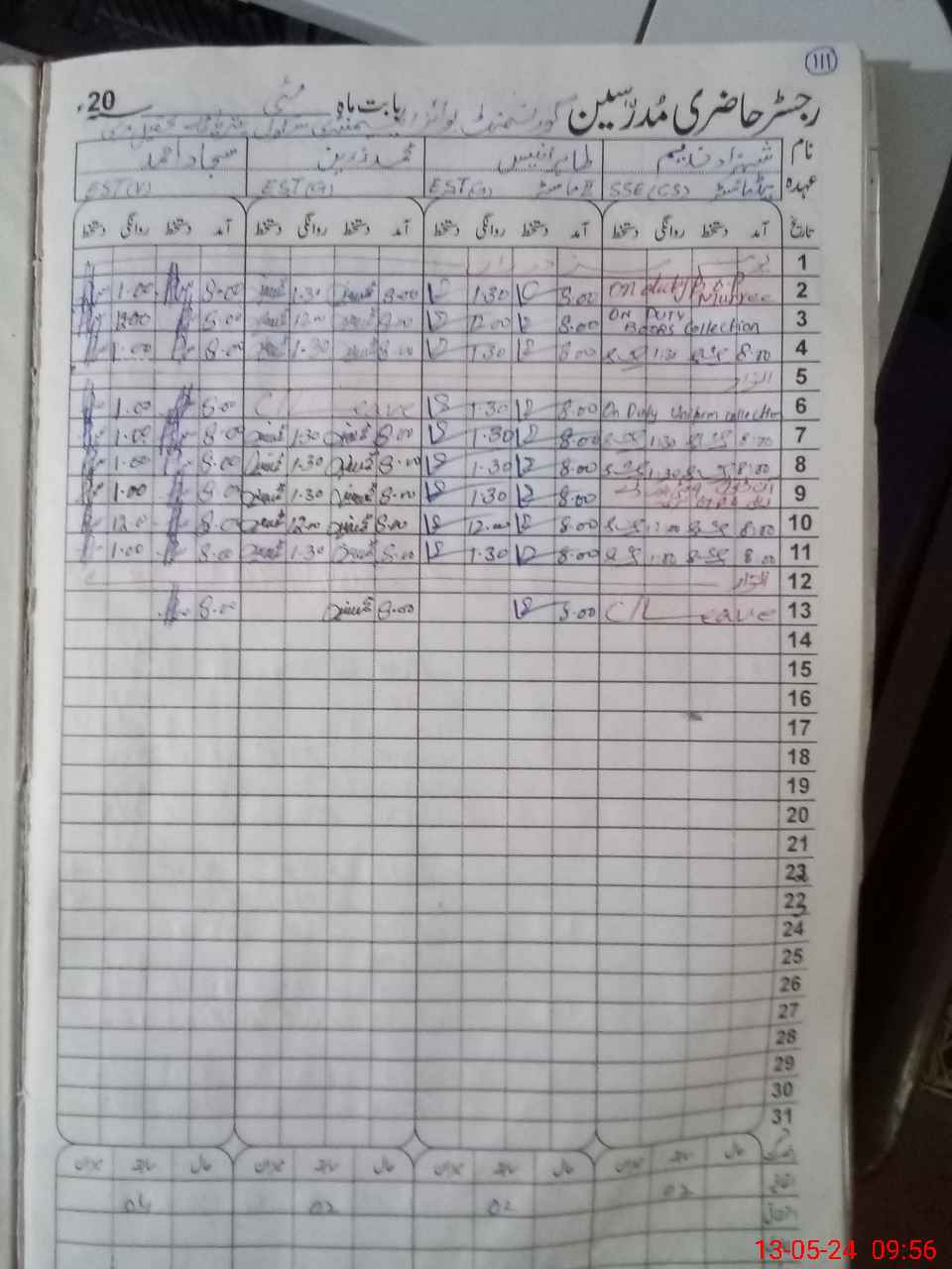 | CNIC | Full Name | Designation | R/C | Absence During Last Calender Month |