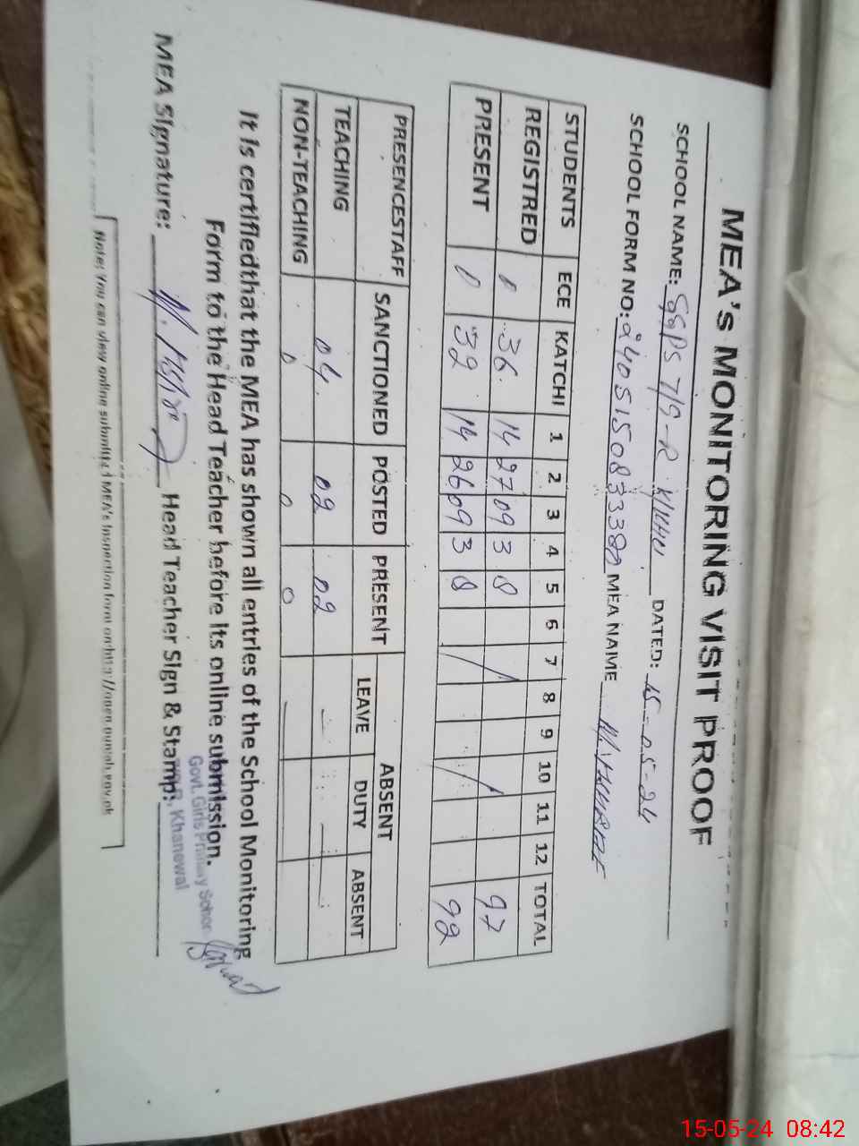 | Attendance Register | Head Teacher | MEA with School | Visit Proof |