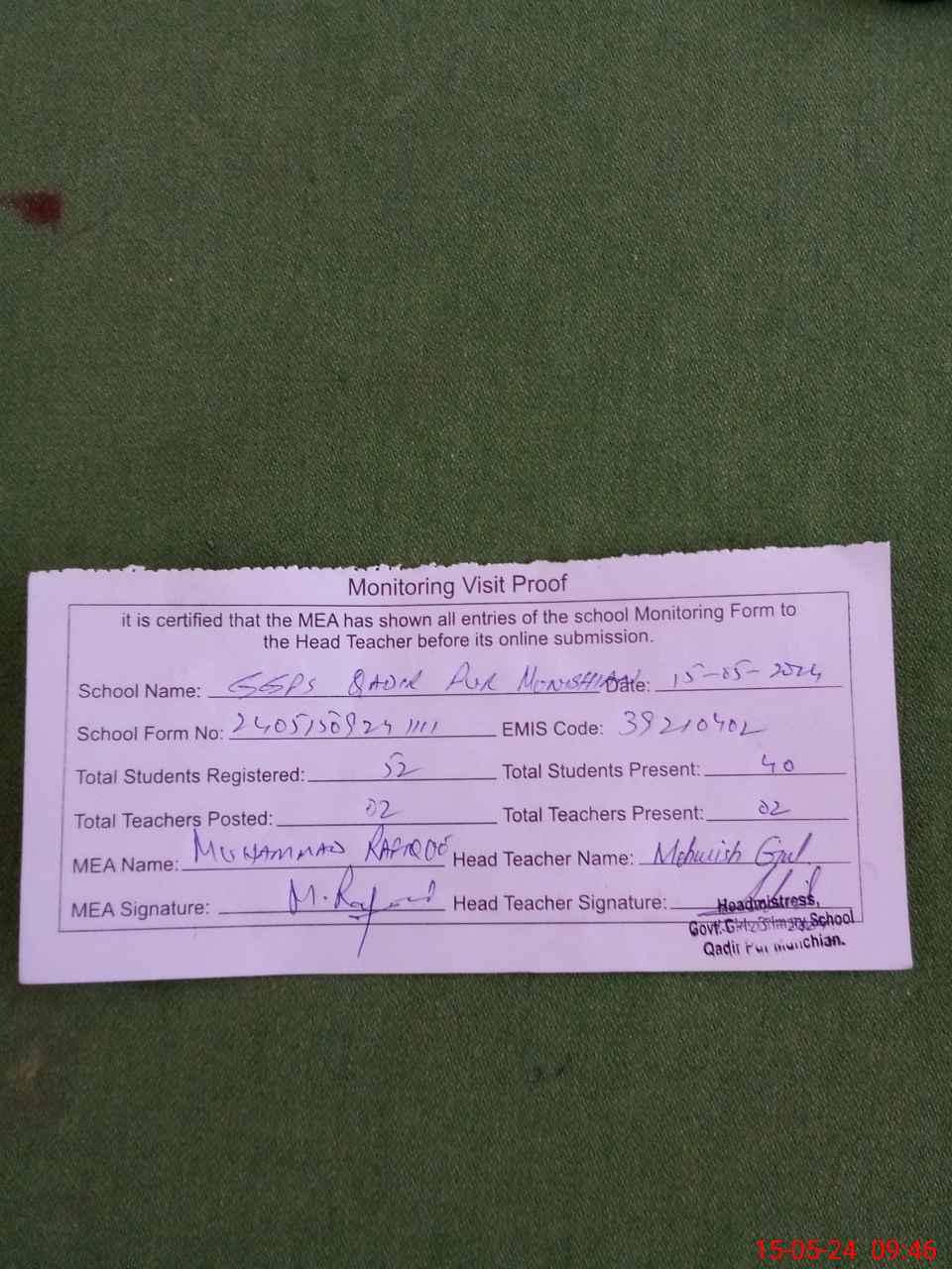 | Attendance Register | Head Teacher | MEA with School | Visit Proof |