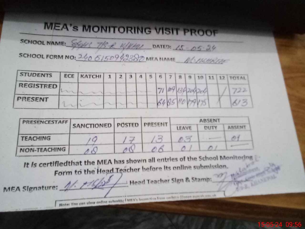 | Attendance Register | Head Teacher | MEA with School | Visit Proof |