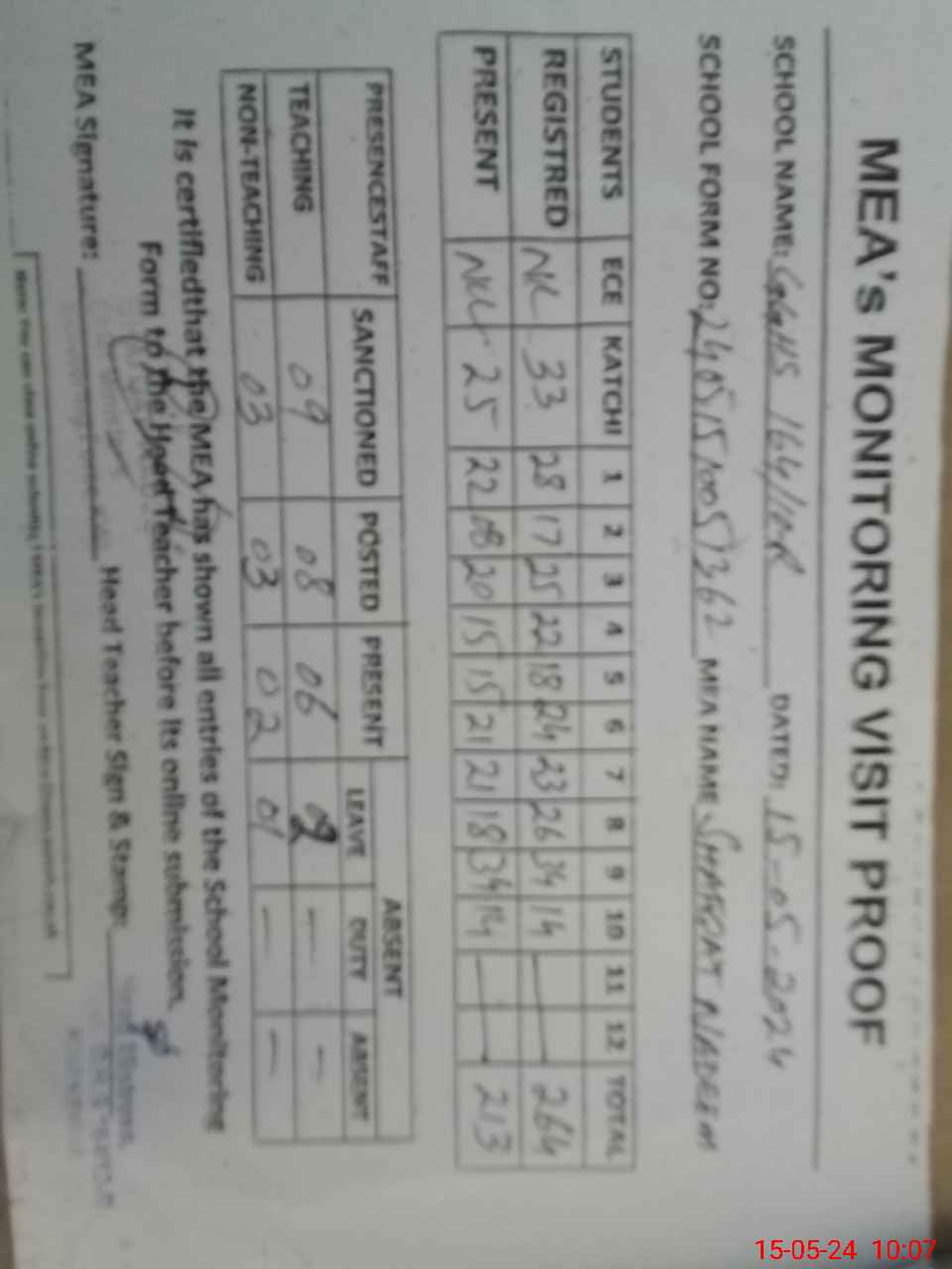 | Certified that this School was Inspected by the Undersigned MEA/DMO Today and the Information Stated Above is as Per Record. | |||||