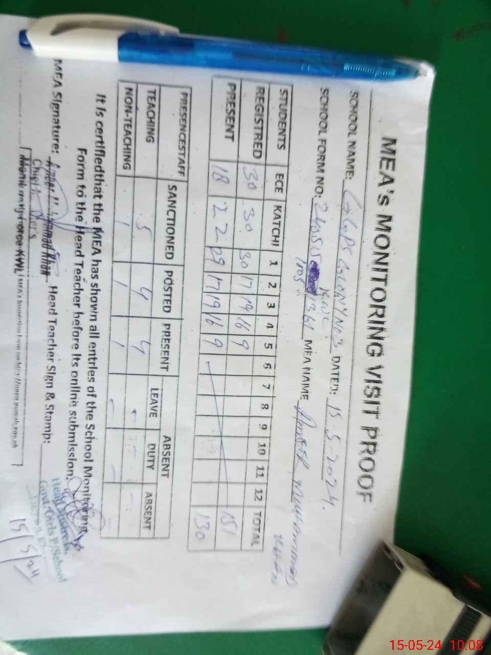 | Attendance Register | Head Teacher | MEA with School | Visit Proof |