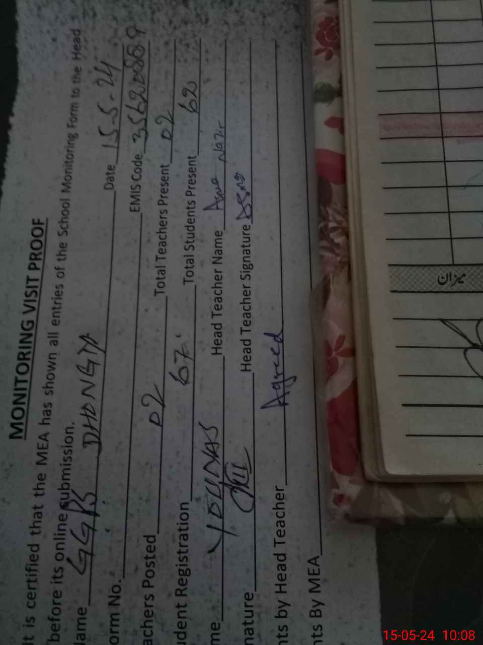 | Attendance Register | Head Teacher | MEA with School | Visit Proof |