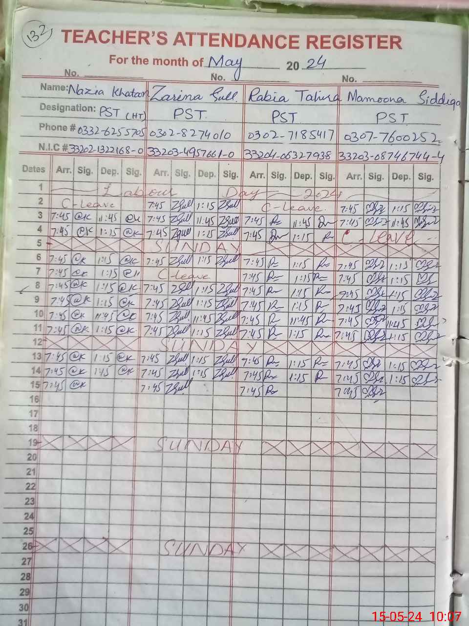 | CNIC | Full Name | Designation | R/C | Absence During Last Calender Month |