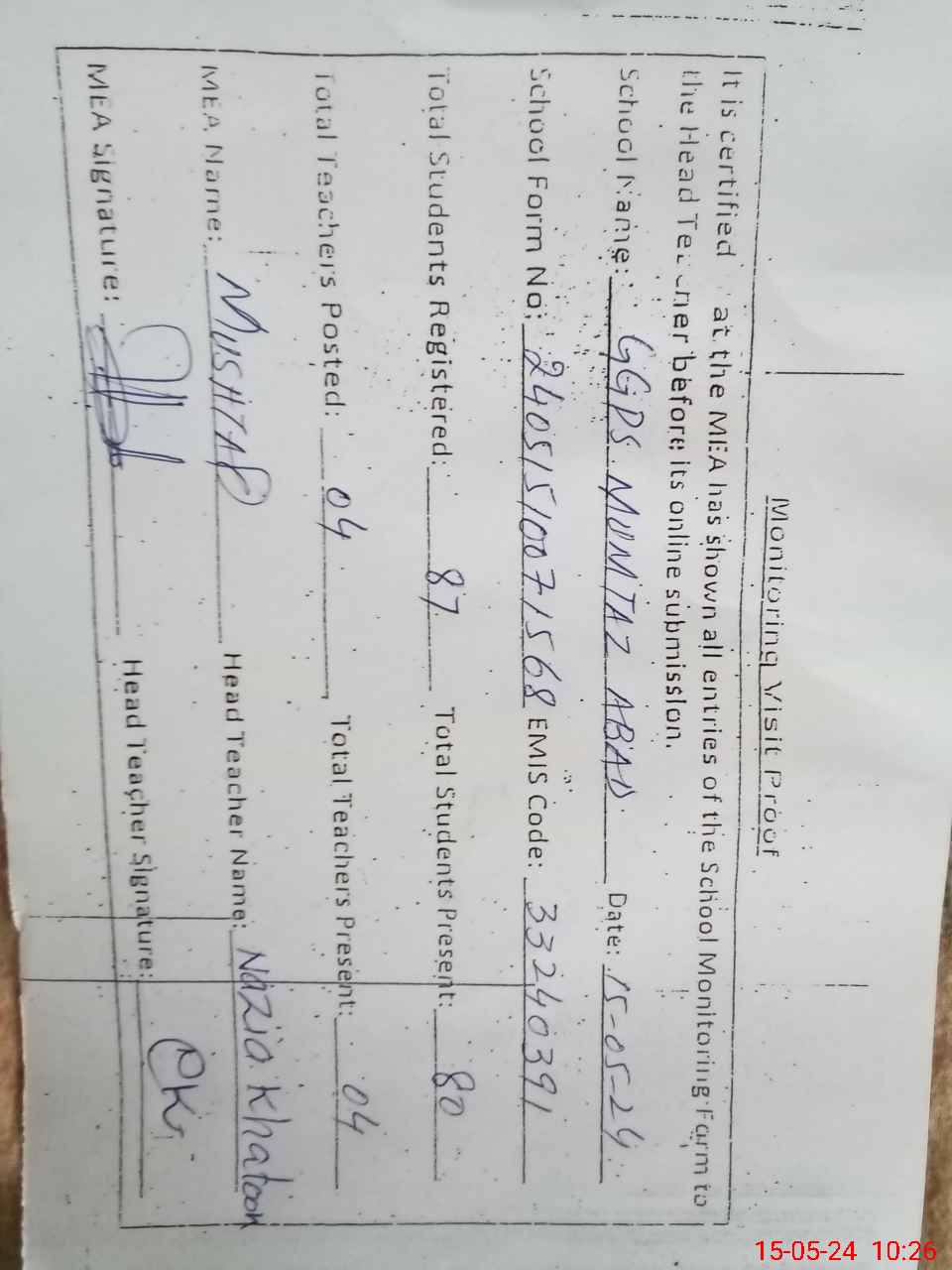 | Attendance Register | Head Teacher | MEA with School | Visit Proof |