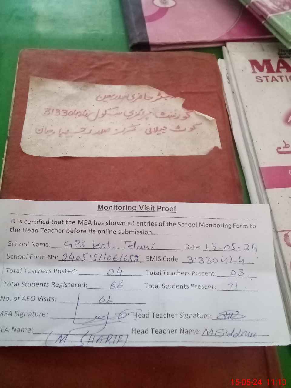 | Attendance Register | Head Teacher | MEA with School | Visit Proof |