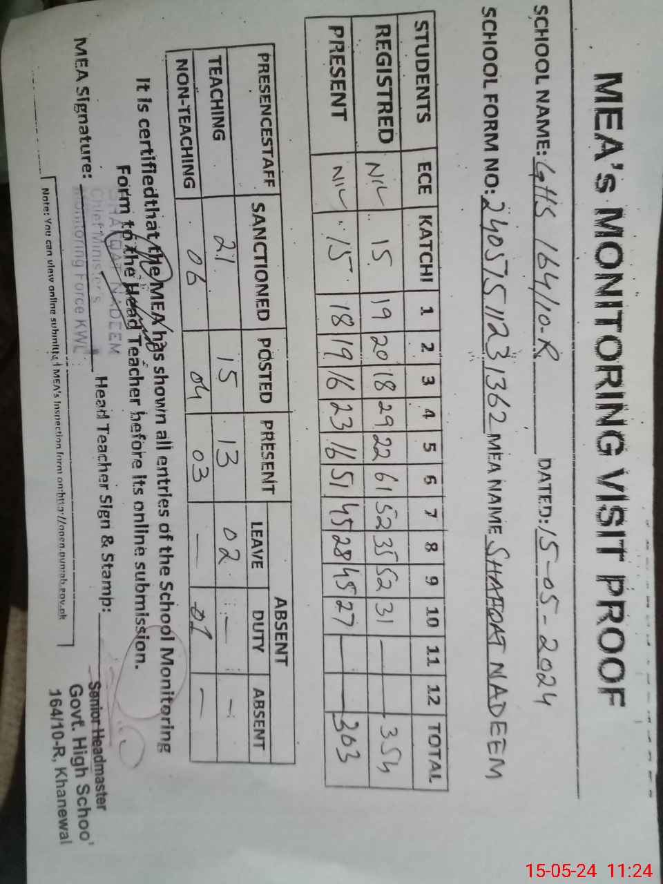 | Attendance Register | Head Teacher | MEA with School | Visit Proof |