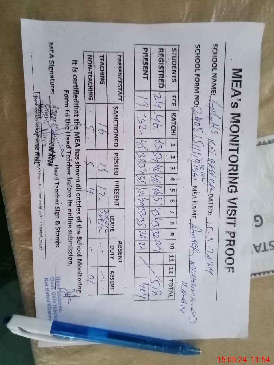 | Attendance Register | Head Teacher | MEA with School | Visit Proof |