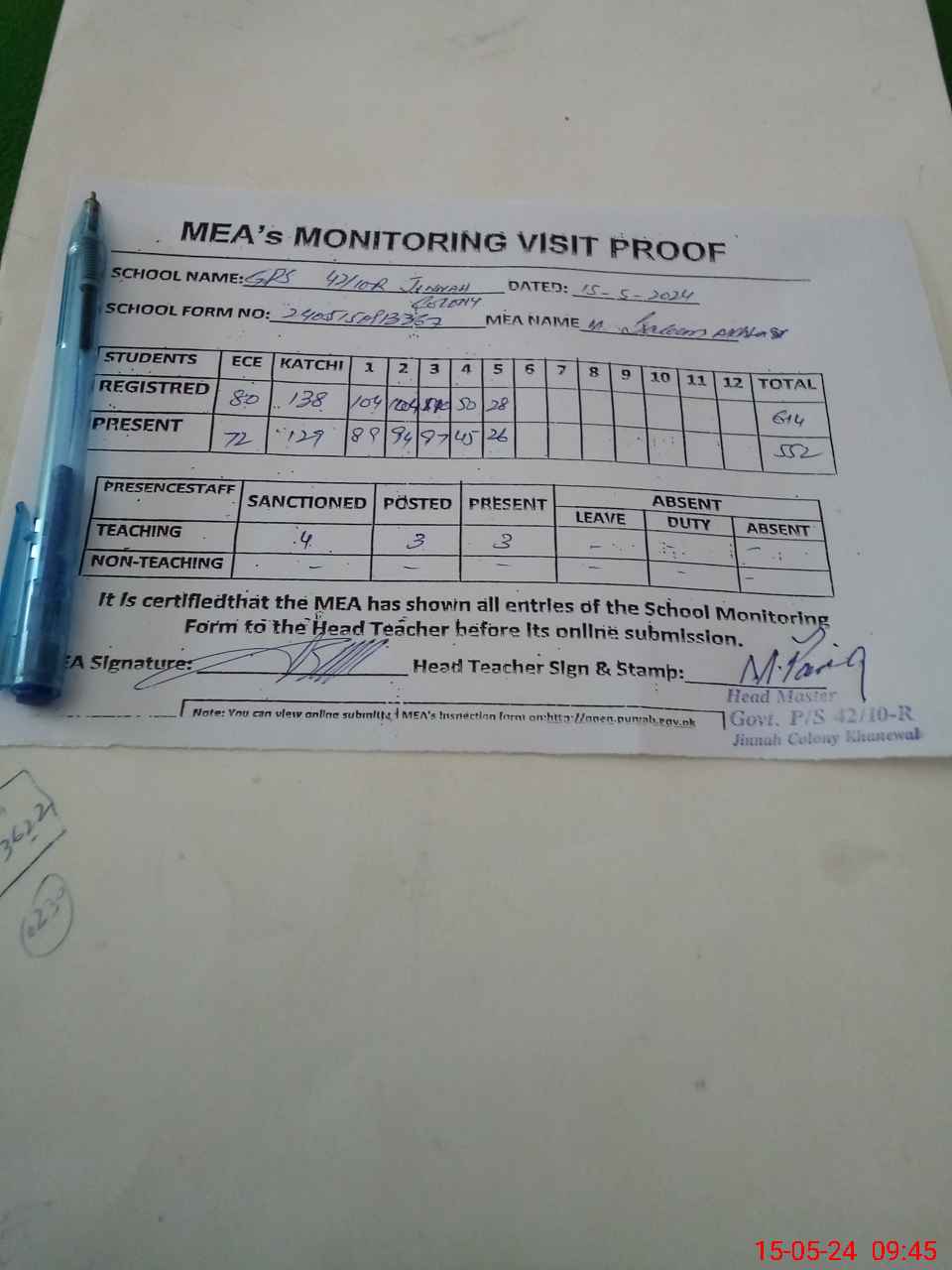 | Attendance Register | Head Teacher | MEA with School | Visit Proof |