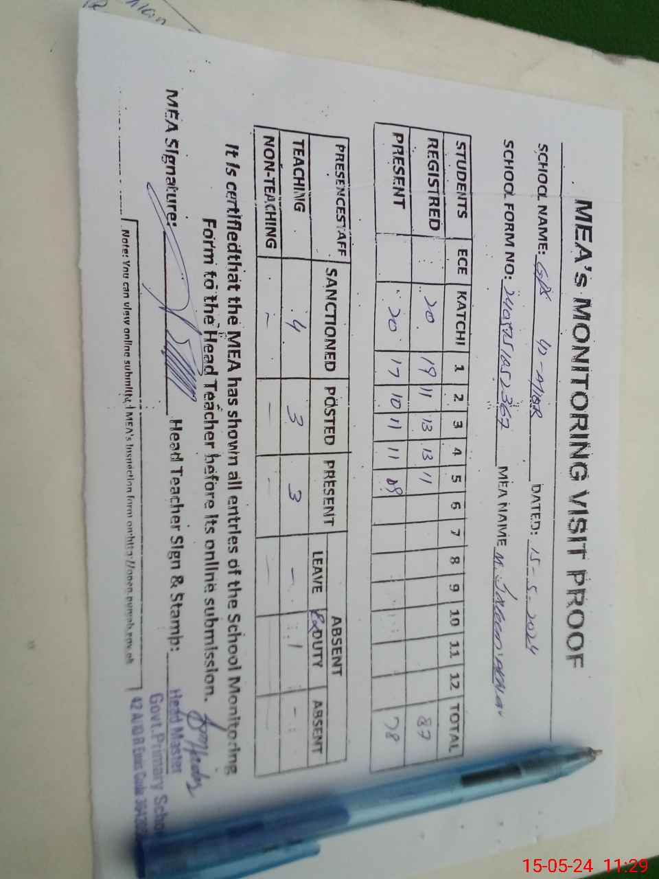 | Attendance Register | Head Teacher | MEA with School | Visit Proof |
