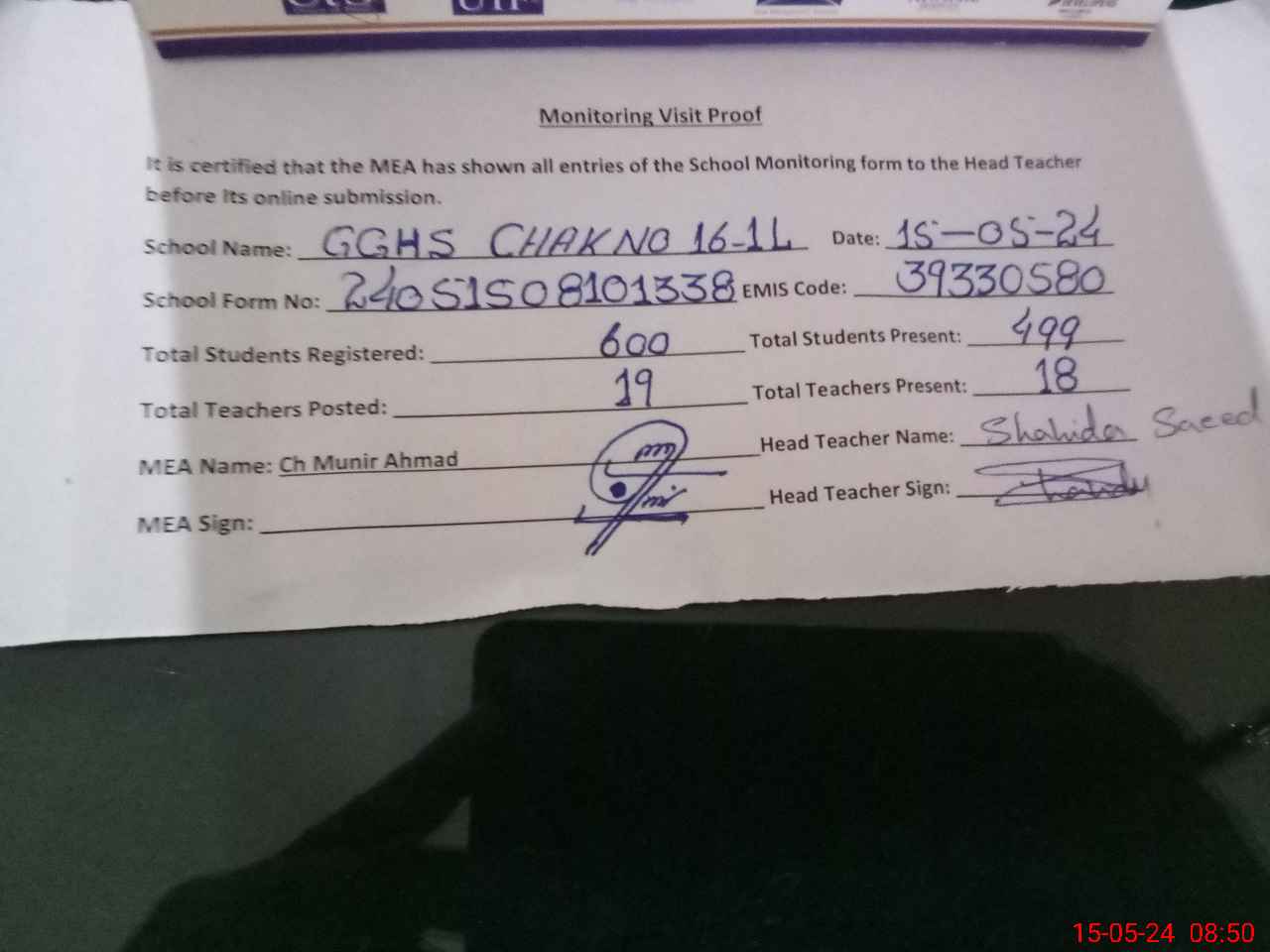 | Attendance Register | Head Teacher | MEA with School | Visit Proof |