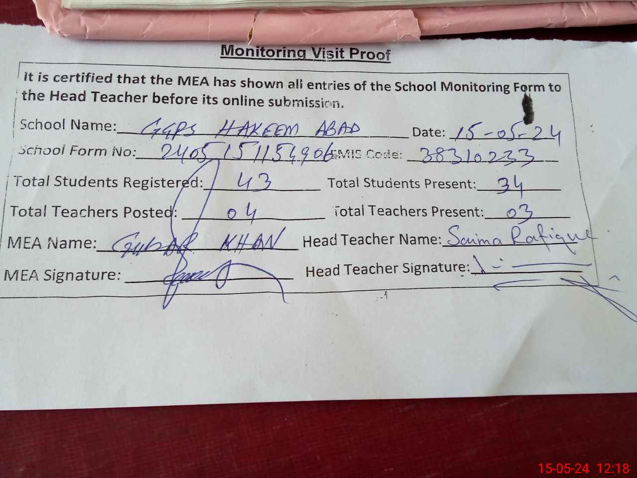| Attendance Register | Head Teacher | MEA with School | Visit Proof |