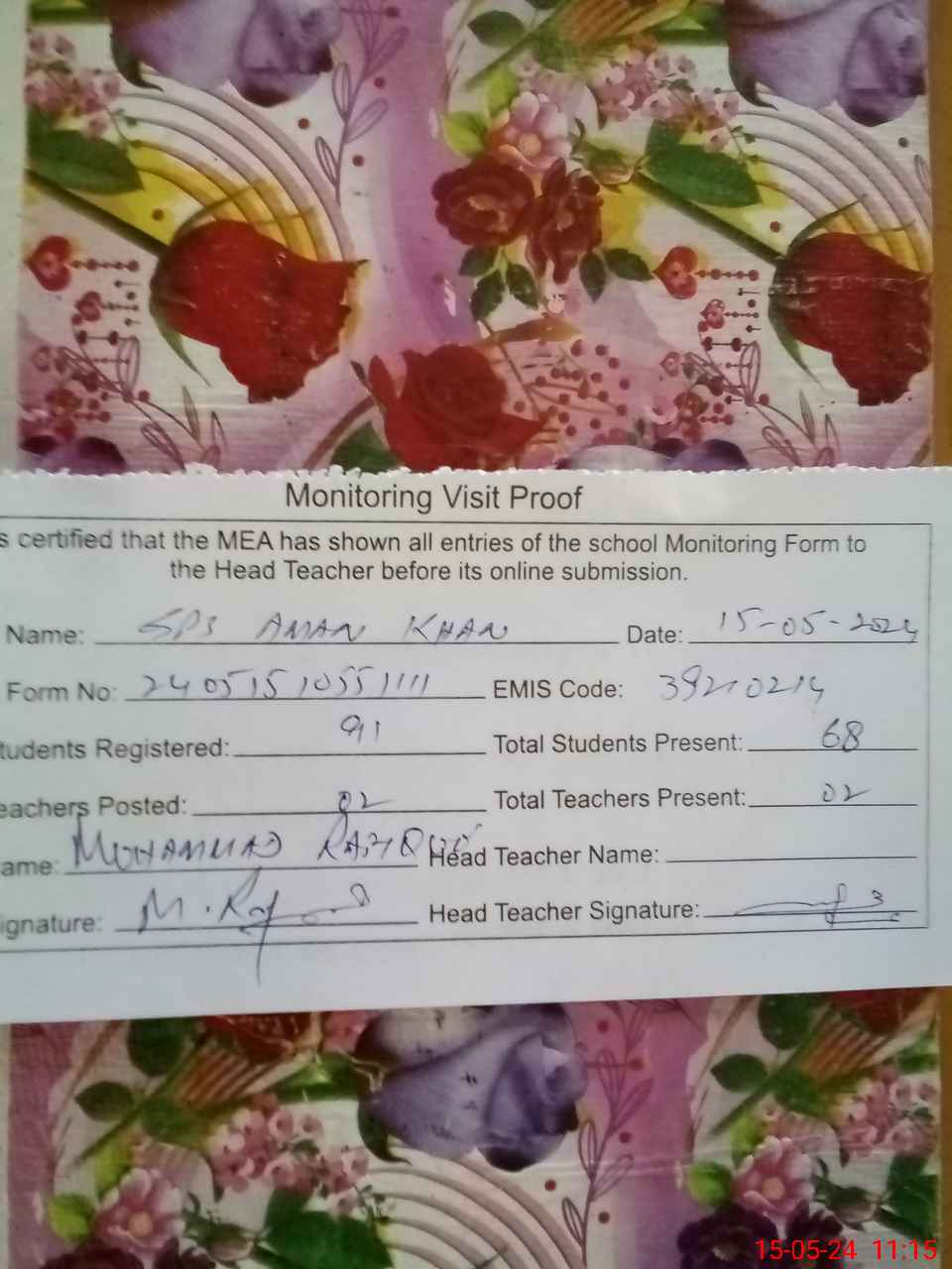 | Attendance Register | Head Teacher | MEA with School | Visit Proof |