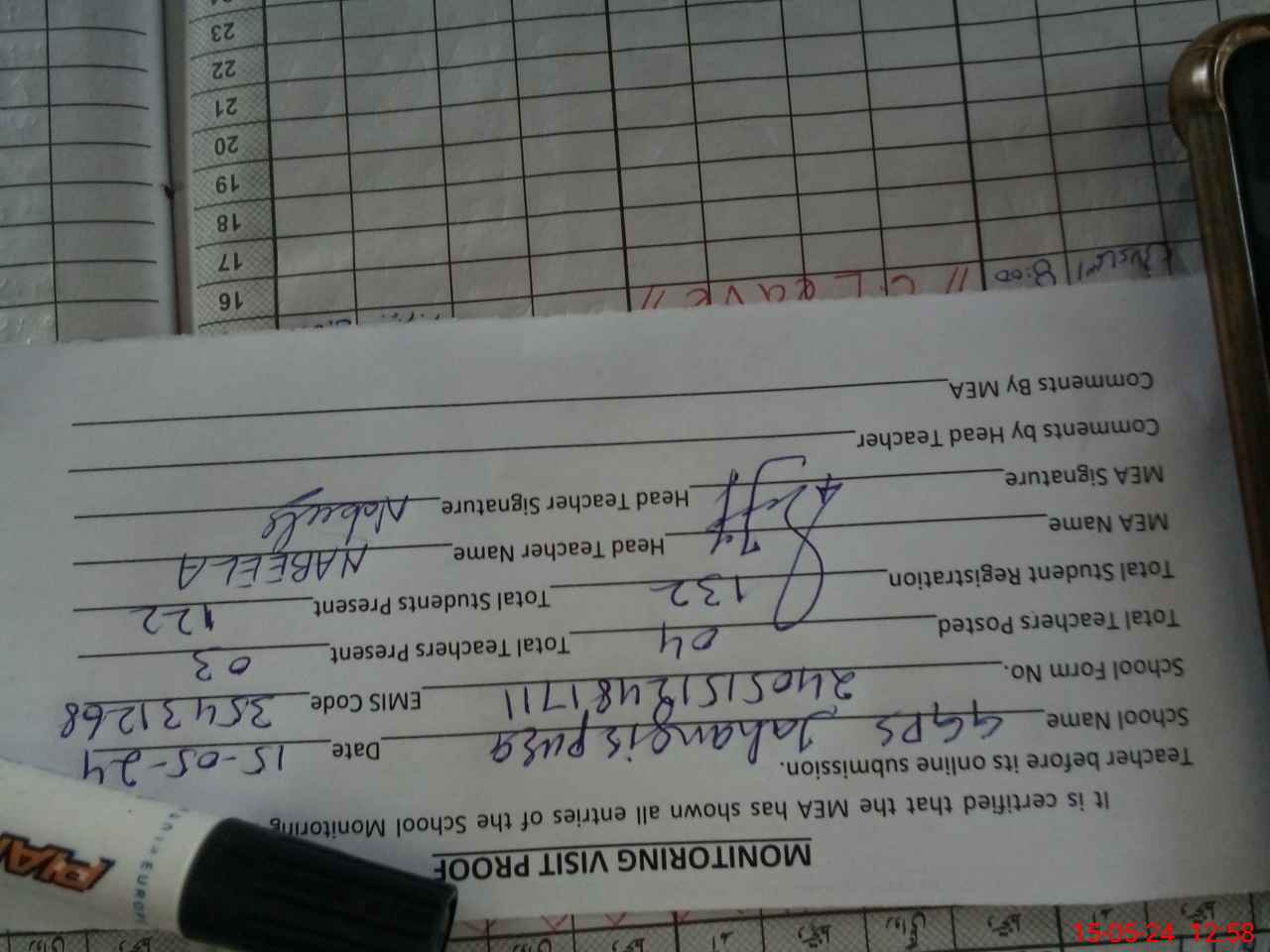 | Attendance Register | Head Teacher | MEA with School | Visit Proof |