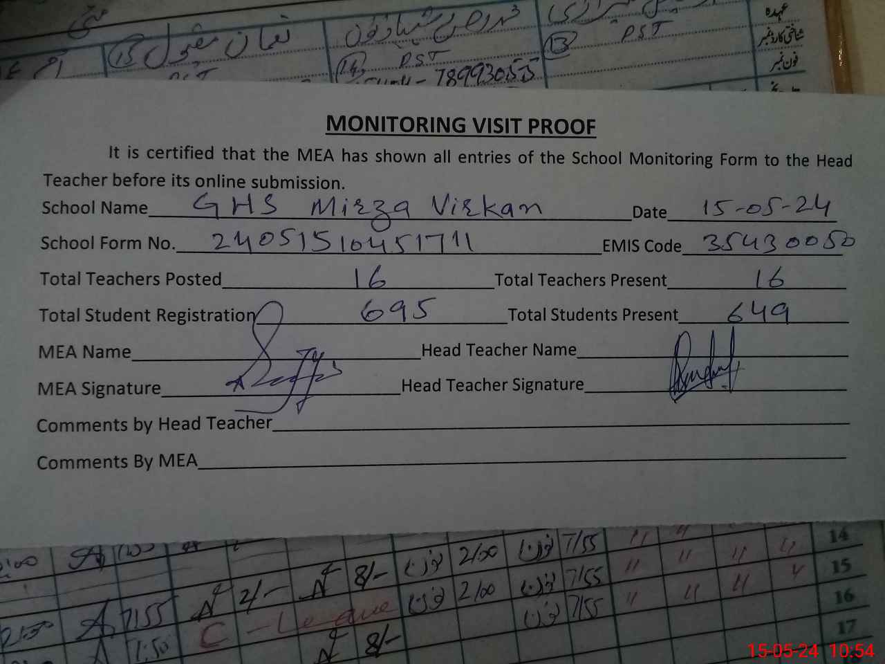 | Attendance Register | Head Teacher | MEA with School | Visit Proof |