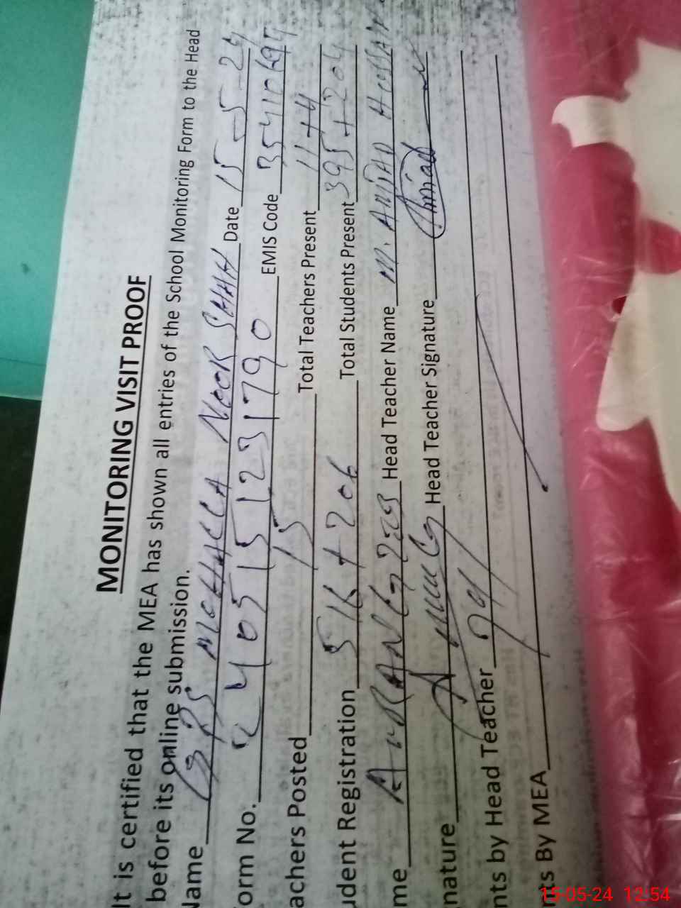 | Attendance Register | Head Teacher | MEA with School | Visit Proof |