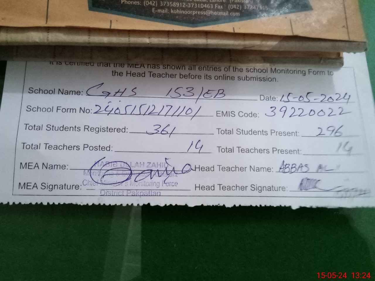 | EMIS Code: 39220022 | Name of School: GHS 153 EB | |||