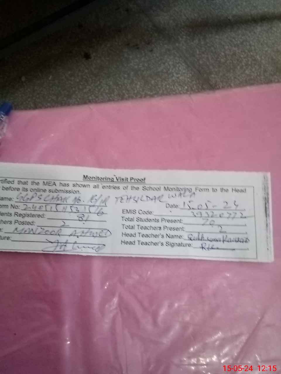 | Attendance Register | Head Teacher | MEA with School | Visit Proof |