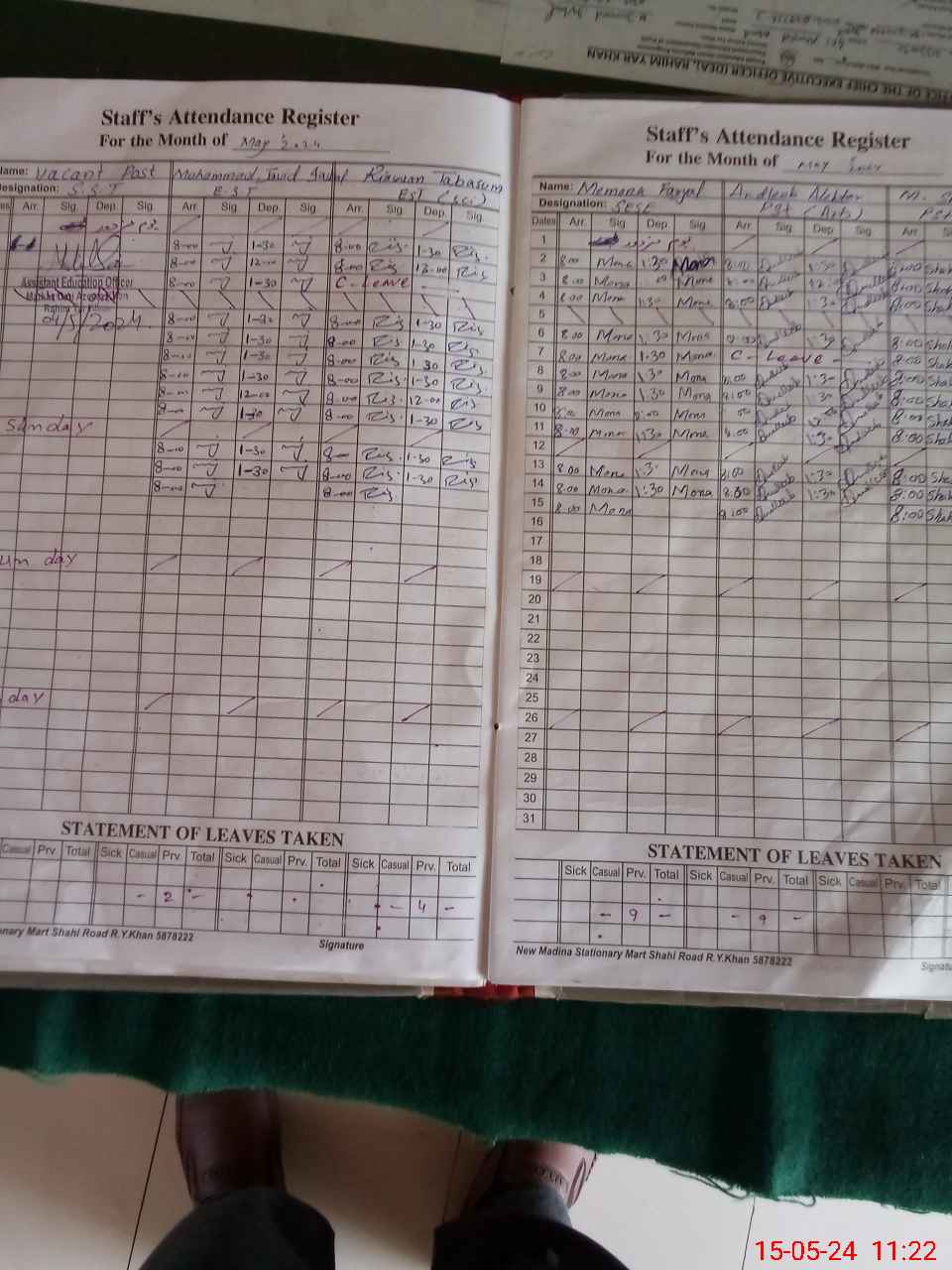 | CNIC | Full Name | Designation | R/C | Absence During Last Calender Month |