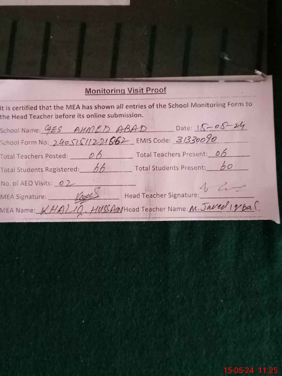 | Attendance Register | Head Teacher | MEA with School | Visit Proof |