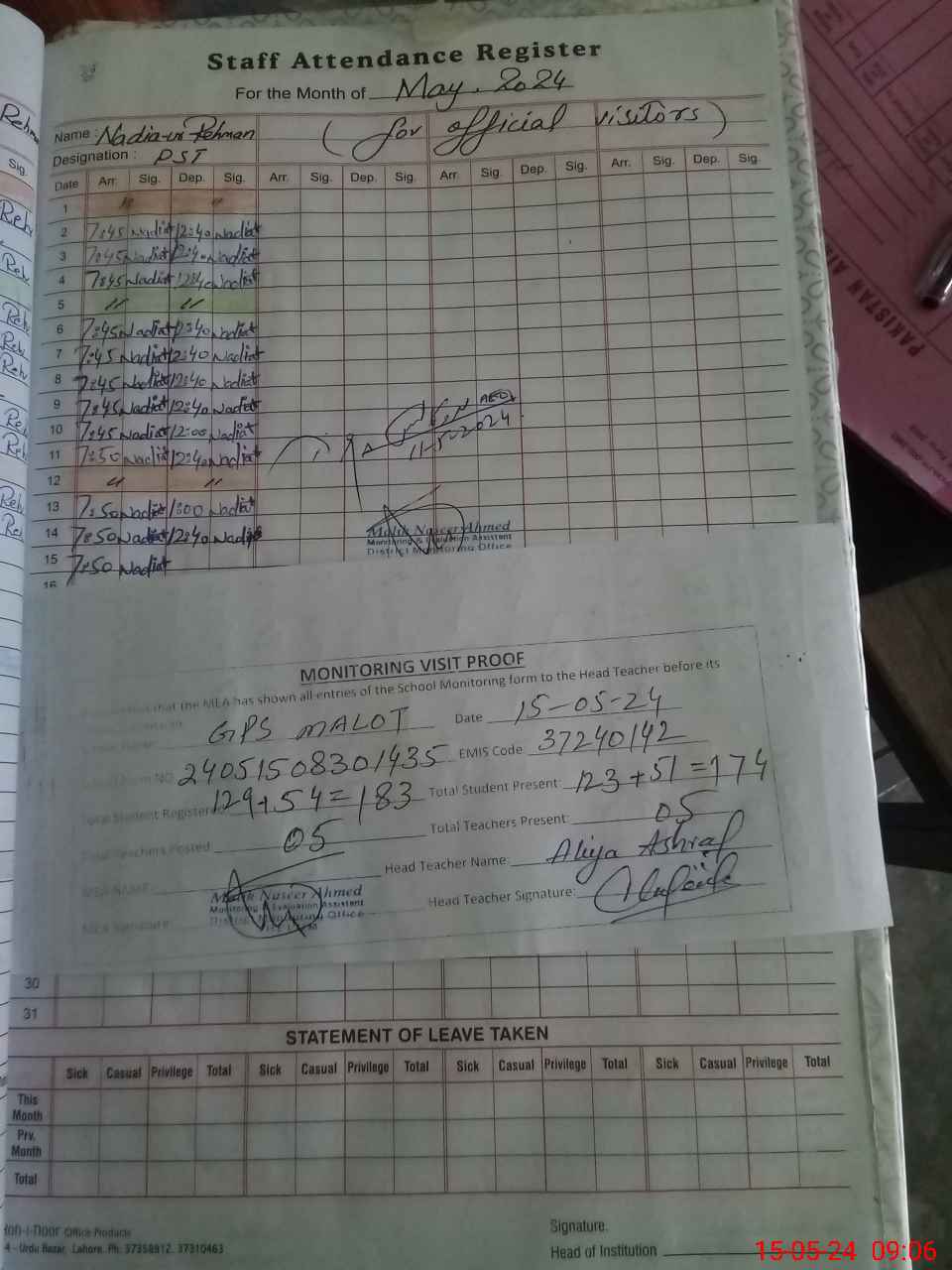 | Attendance Register | Head Teacher | MEA with School | Visit Proof |