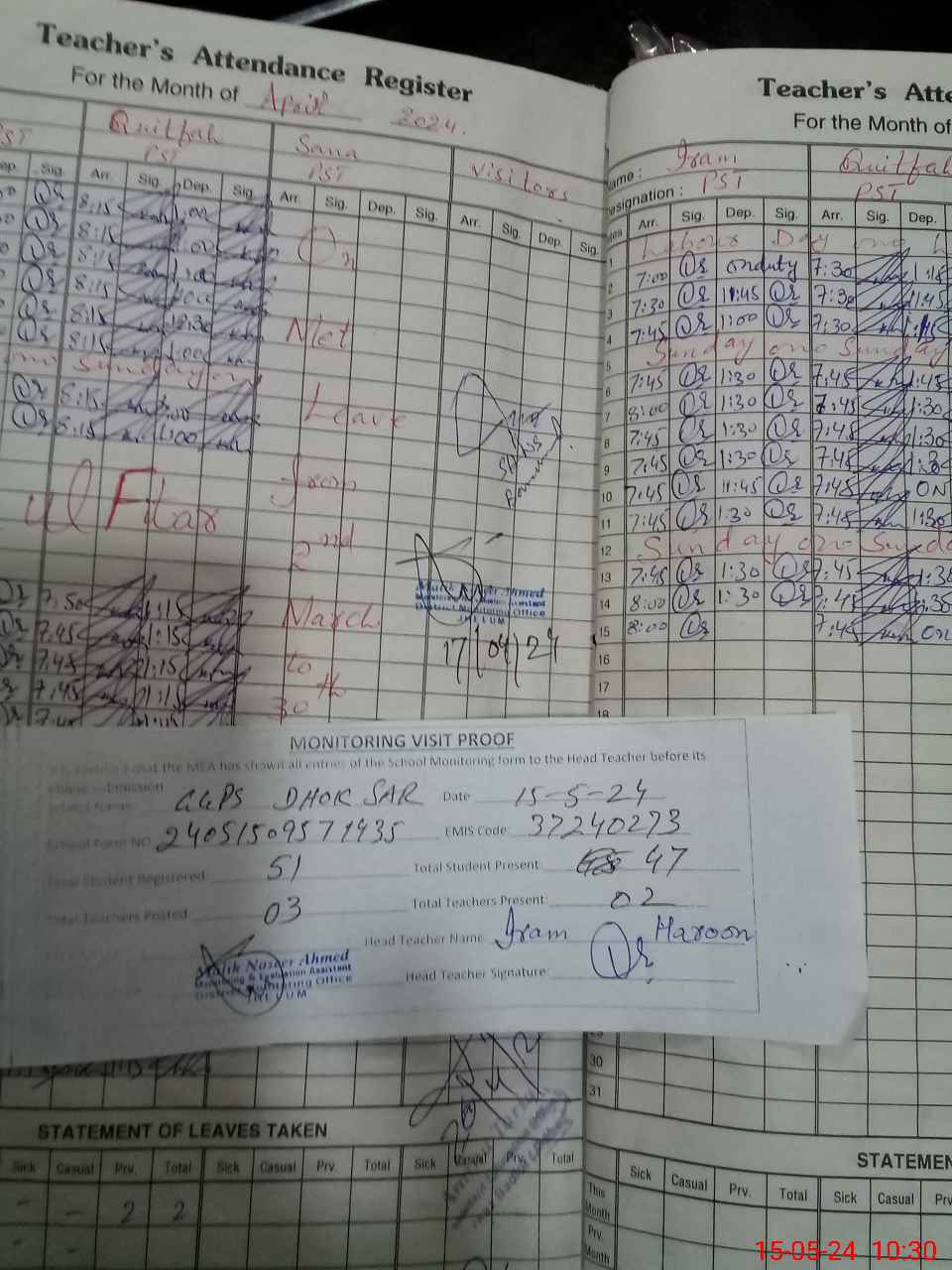 | Attendance Register | Head Teacher | MEA with School | Visit Proof |