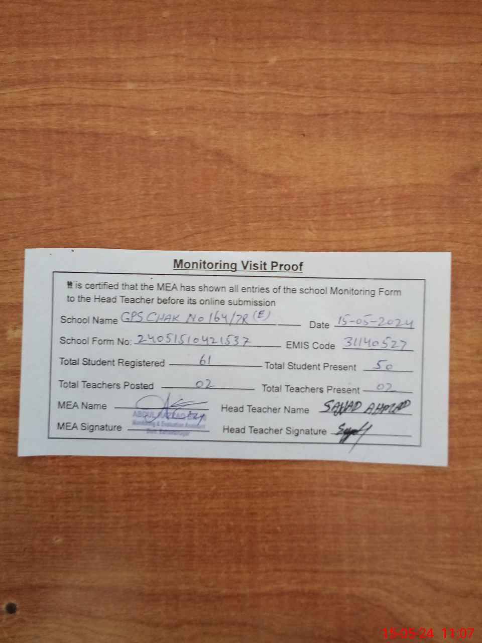 | Attendance Register | Head Teacher | MEA with School | Visit Proof |
