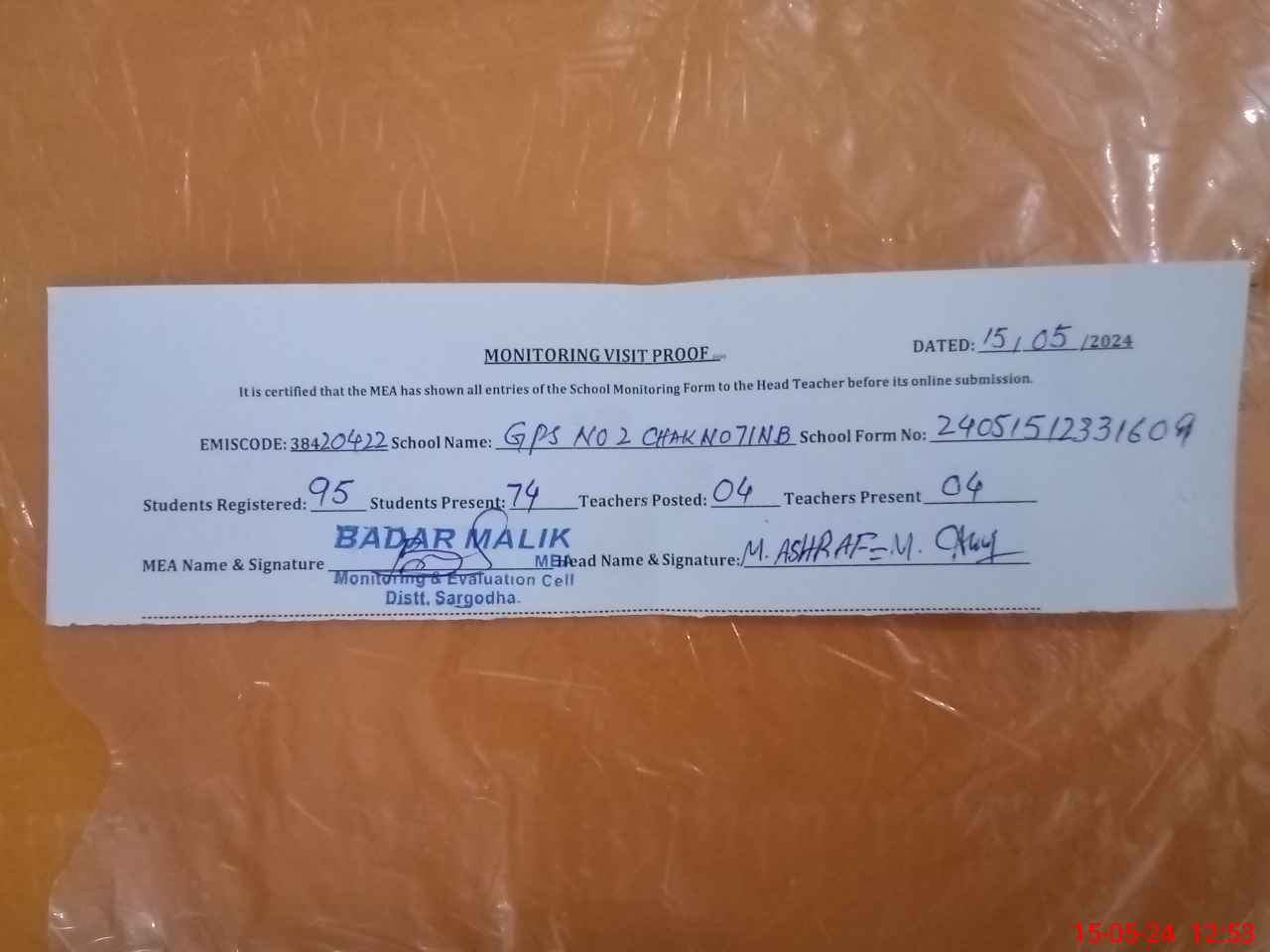 | Attendance Register | Head Teacher | MEA with School | Visit Proof |