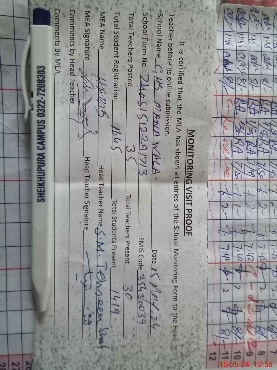 | Attendance Register | Head Teacher | MEA with School | Visit Proof |