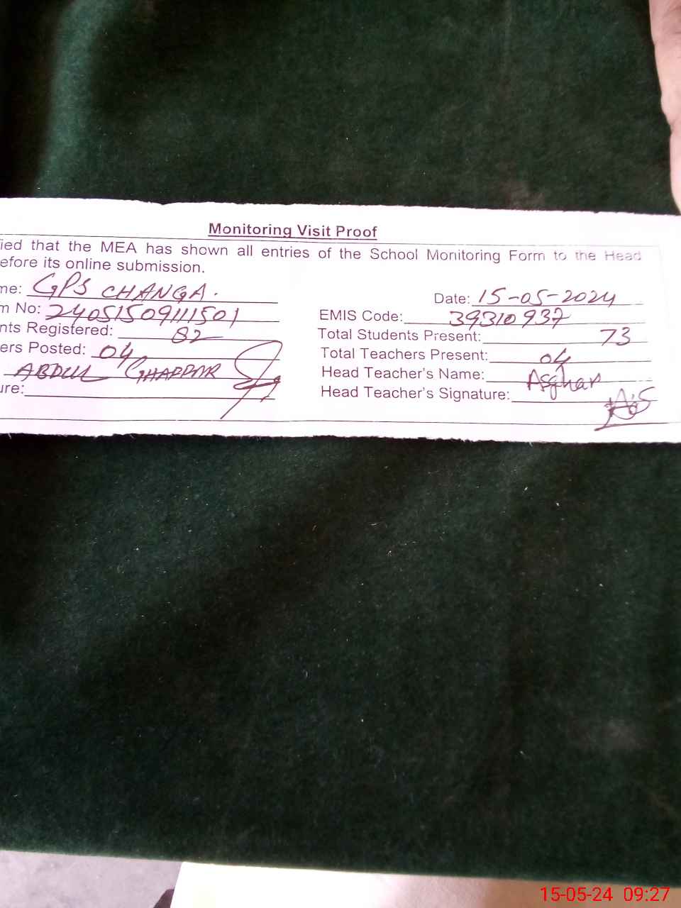 | Attendance Register | Head Teacher | MEA with School | Visit Proof |