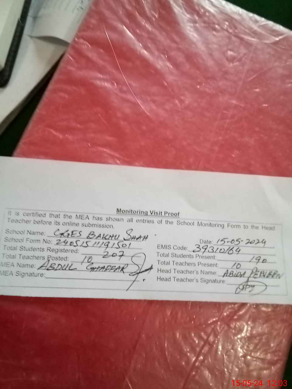 | Attendance Register | Head Teacher | MEA with School | Visit Proof |