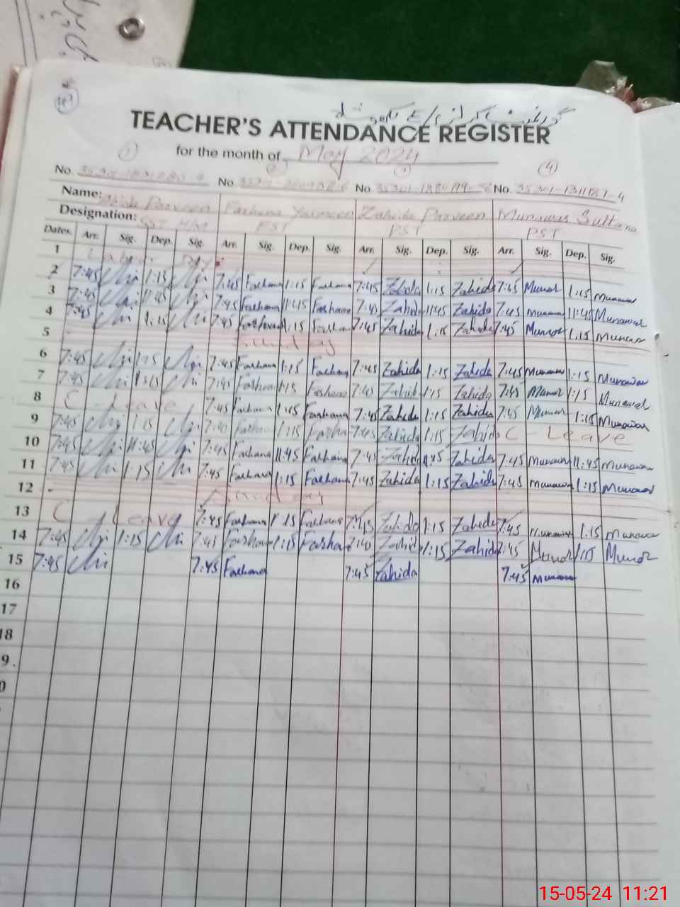 | CNIC | Full Name | Designation | R/C | Absence During Last Calender Month |