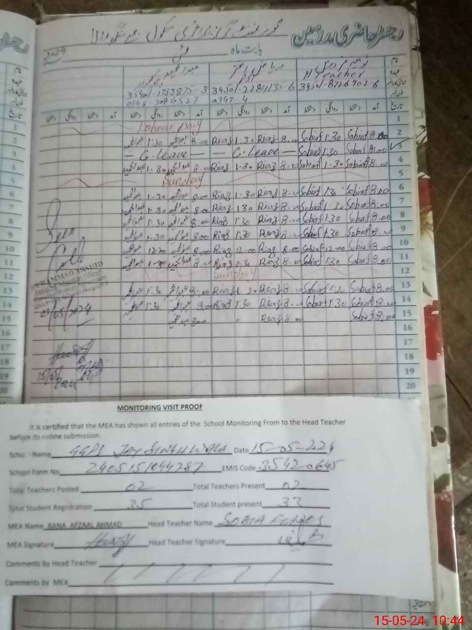 | Attendance Register | Head Teacher | MEA with School | Visit Proof |