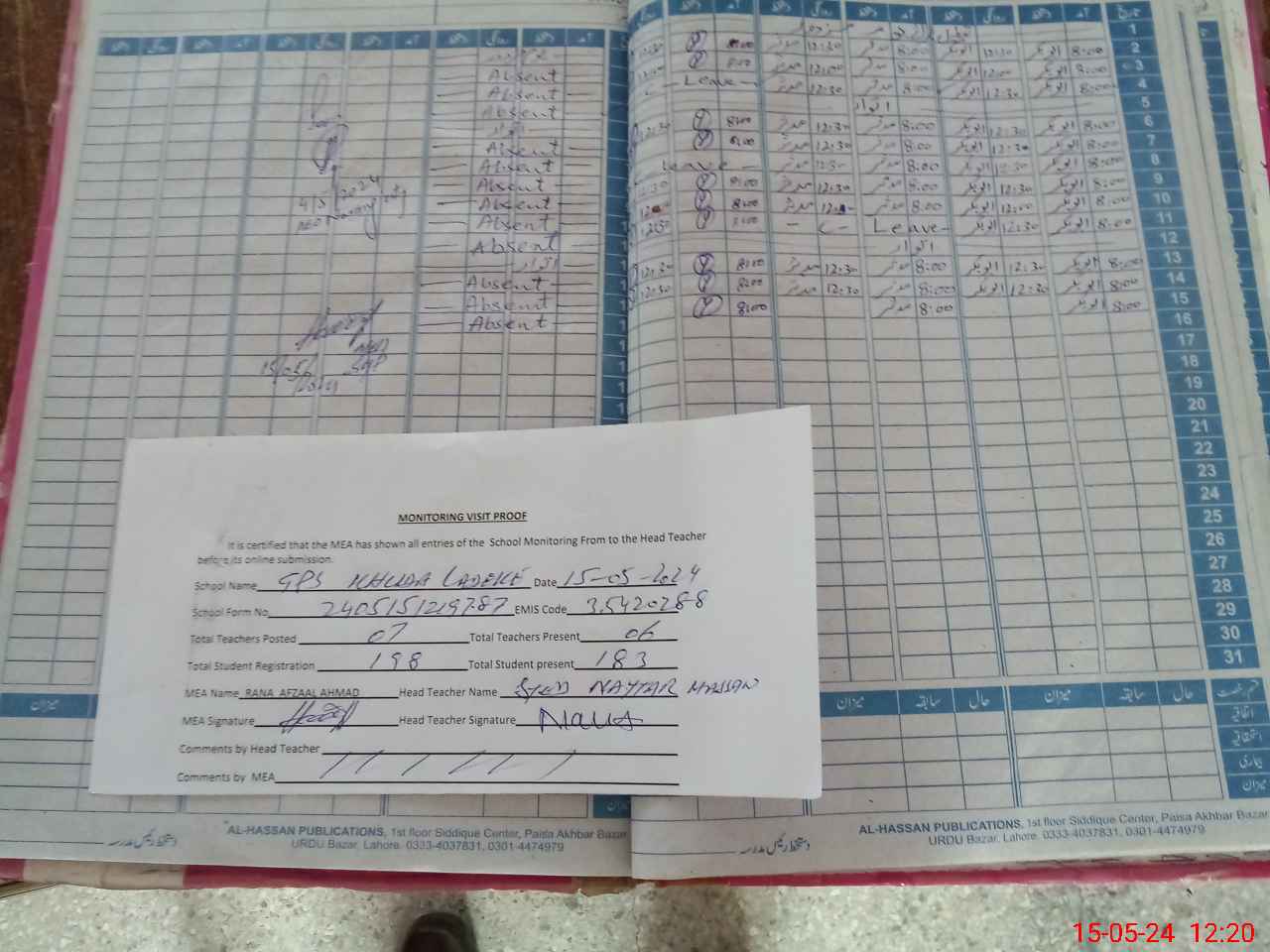 | Attendance Register | Head Teacher | MEA with School | Visit Proof |
