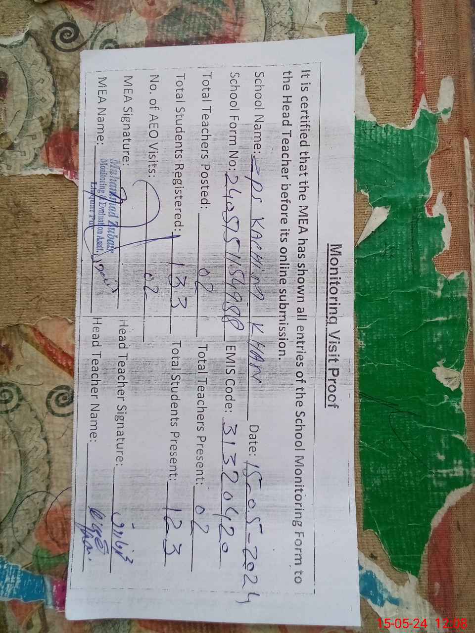 | Attendance Register | Head Teacher | MEA with School | Visit Proof |