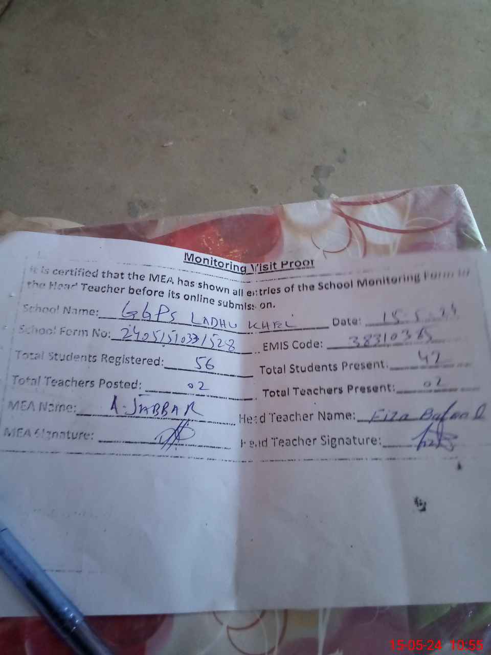 | Certified that this School was Inspected by the Undersigned MEA/DMO Today and the Information Stated Above is as Per Record. | |||||