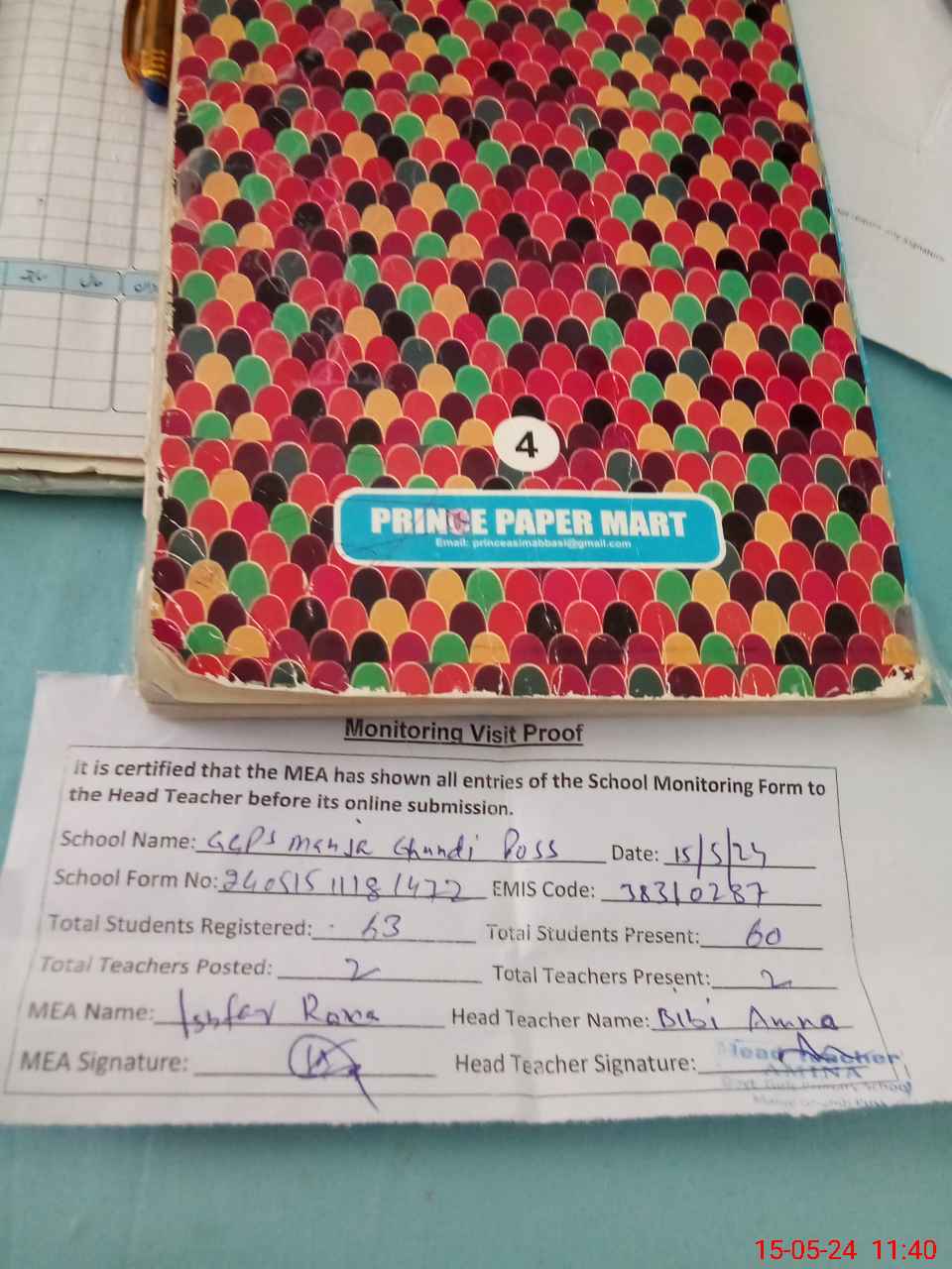 | Attendance Register | Head Teacher | MEA with School | Visit Proof |