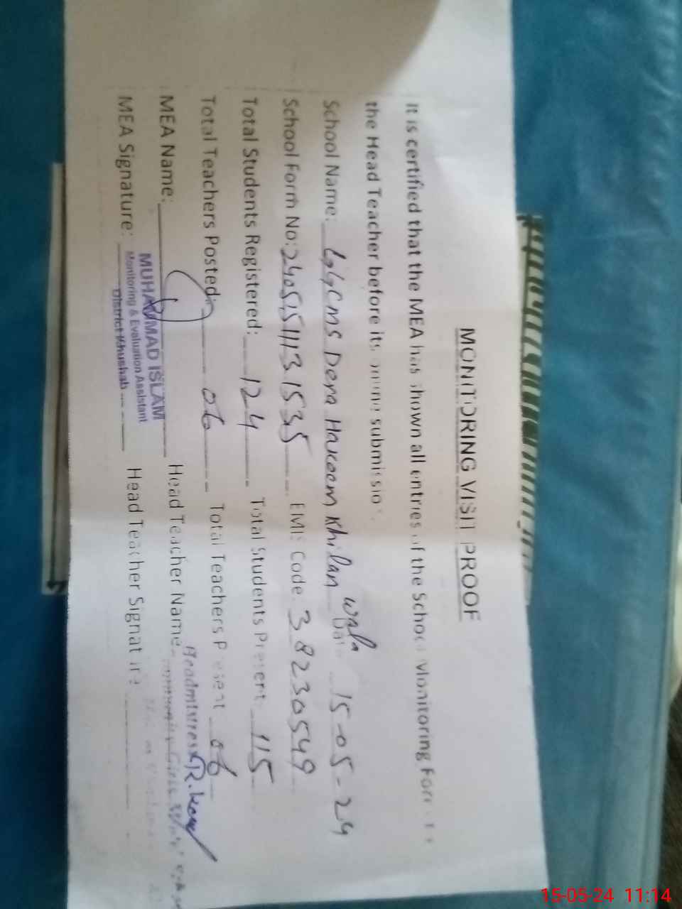 | Attendance Register | Head Teacher | MEA with School | Visit Proof |