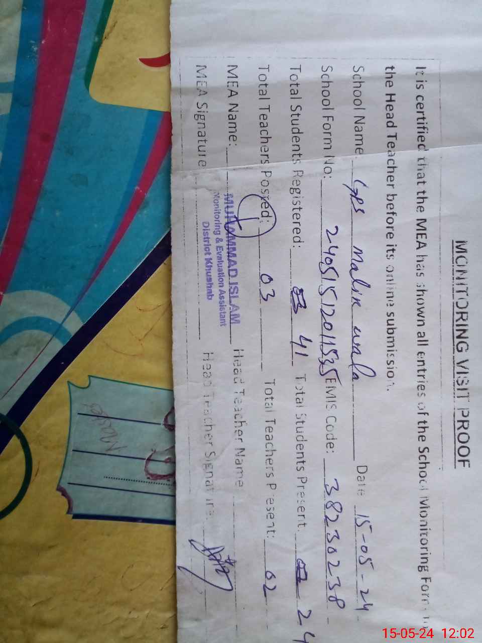 | EMIS Code: 38230238 | Name of School: GPS MALIK WALA | |||