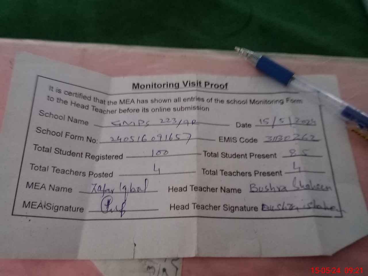 | Attendance Register | Head Teacher | MEA with School | Visit Proof |