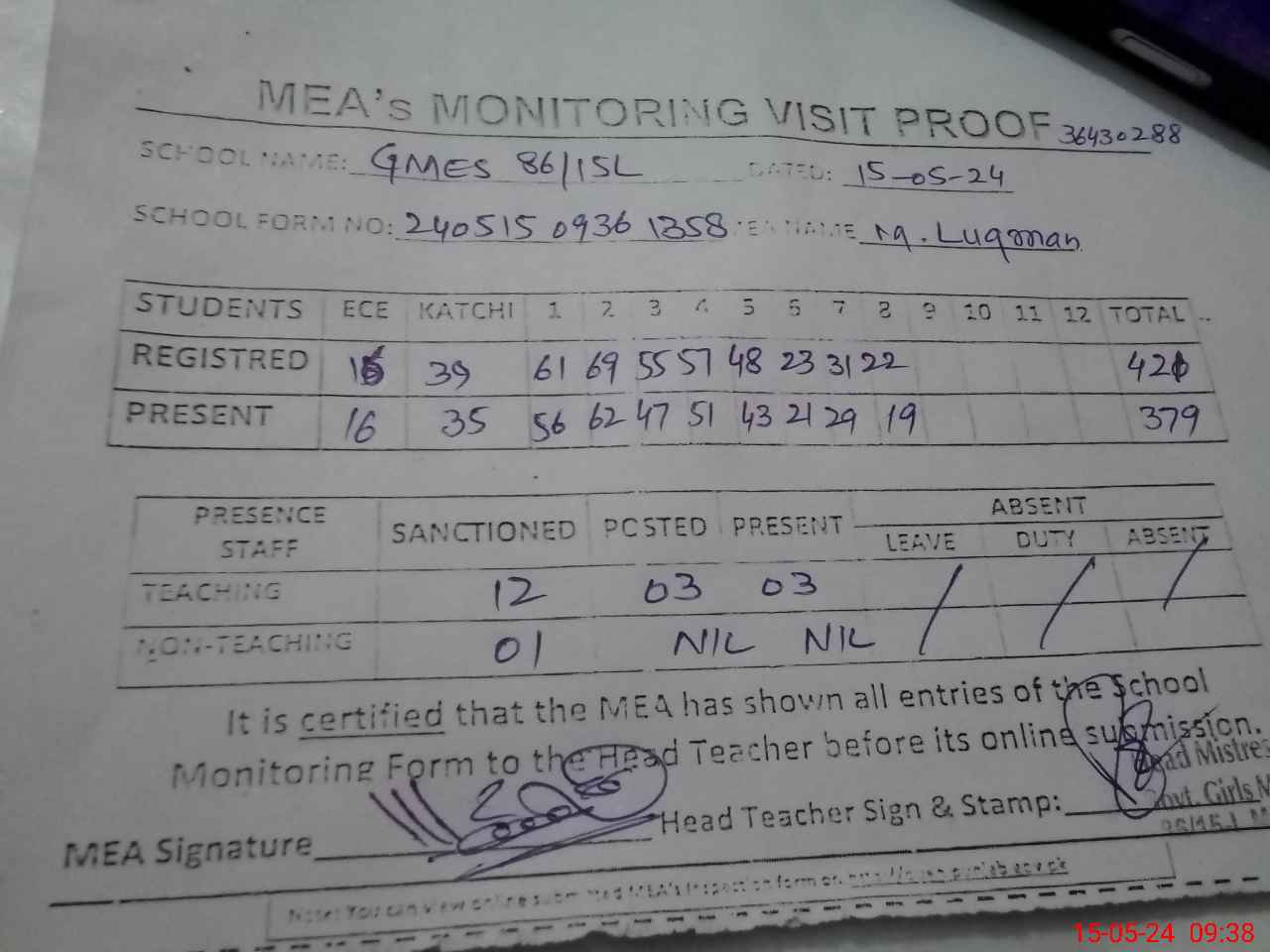 | Attendance Register | Head Teacher | MEA with School | Visit Proof |