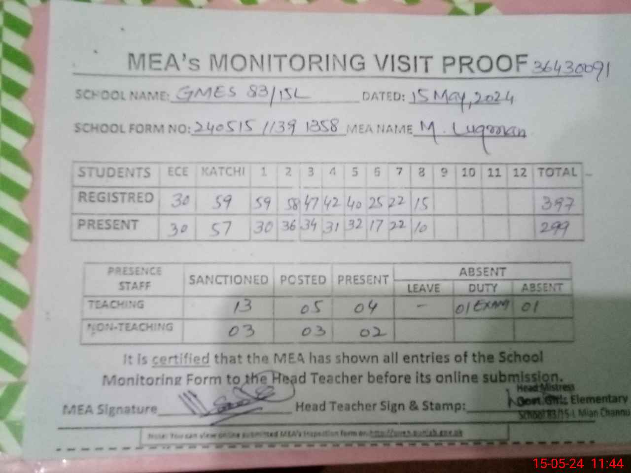 | Certified that this School was Inspected by the Undersigned MEA/DMO Today and the Information Stated Above is as Per Record. | |||||