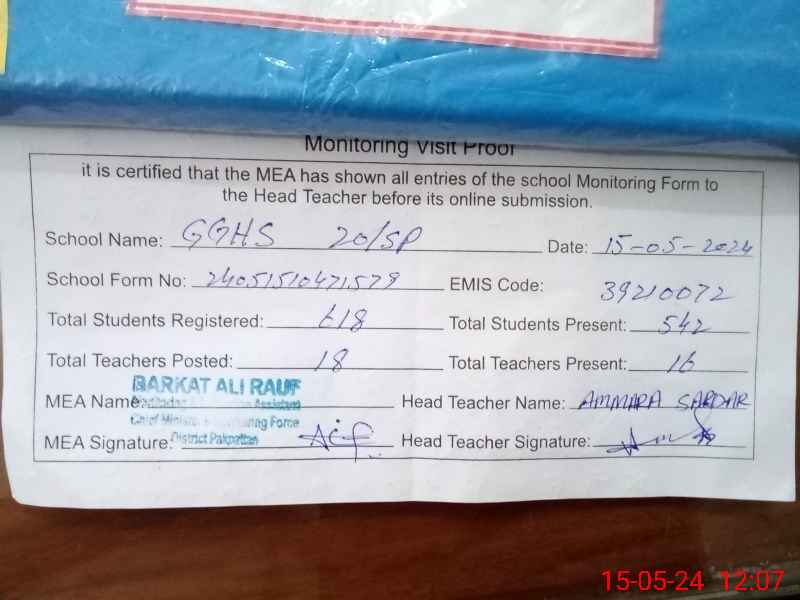 | EMIS Code: 39210072 | Name of School: GGHS 20 SP | |||