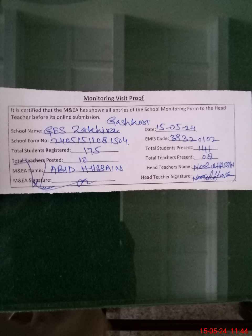 | Attendance Register | Head Teacher | MEA with School | Visit Proof |