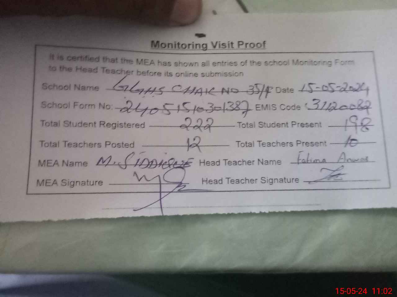 | Attendance Register | Head Teacher | MEA with School | Visit Proof |