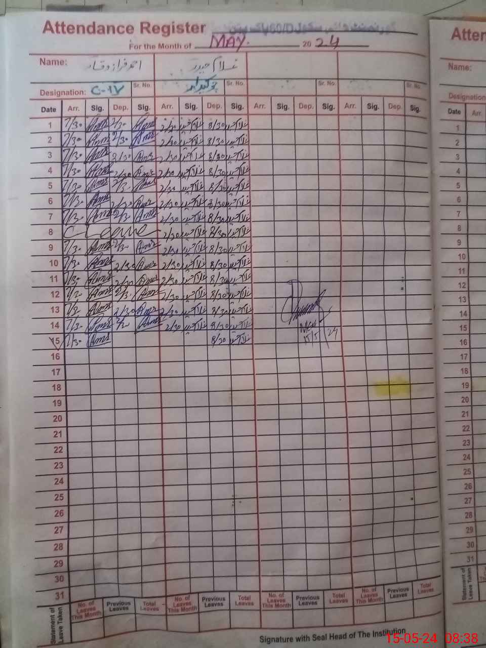 | CNIC | Full Name | Designation | R/C | Absence During Last Calender Month |