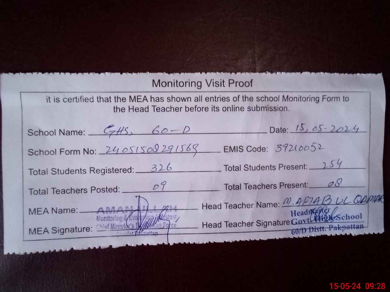 | Attendance Register | Head Teacher | MEA with School | Visit Proof |