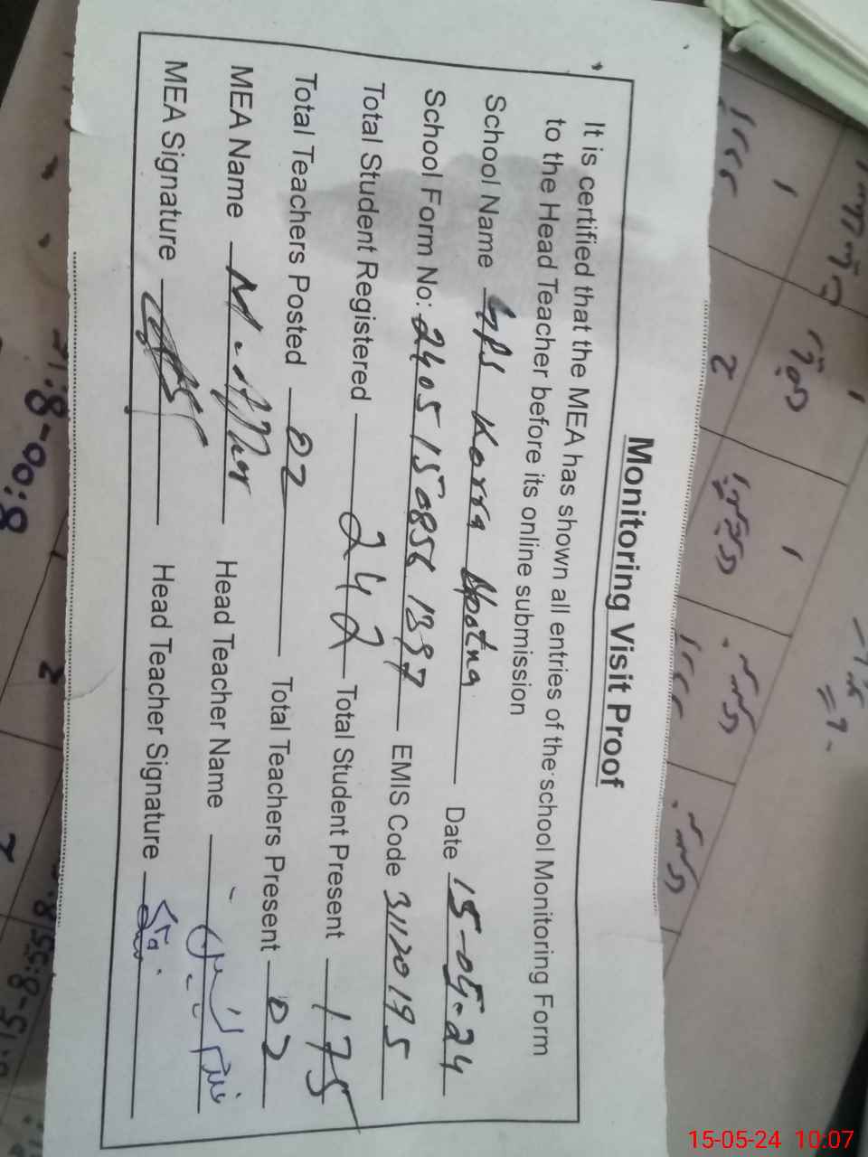 | Certified that this School was Inspected by the Undersigned MEA/DMO Today and the Information Stated Above is as Per Record. | |||||