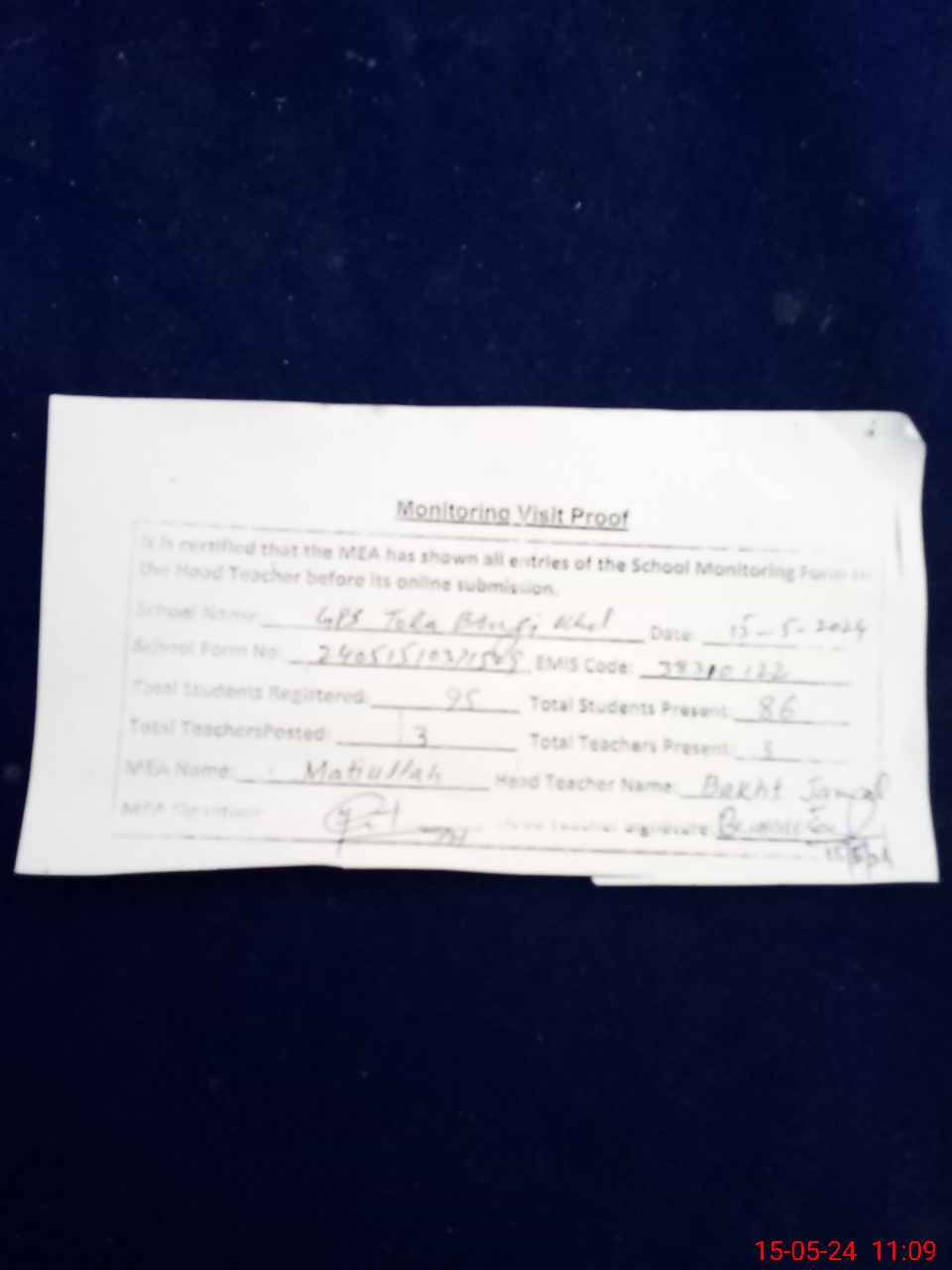 | Attendance Register | Head Teacher | MEA with School | Visit Proof |