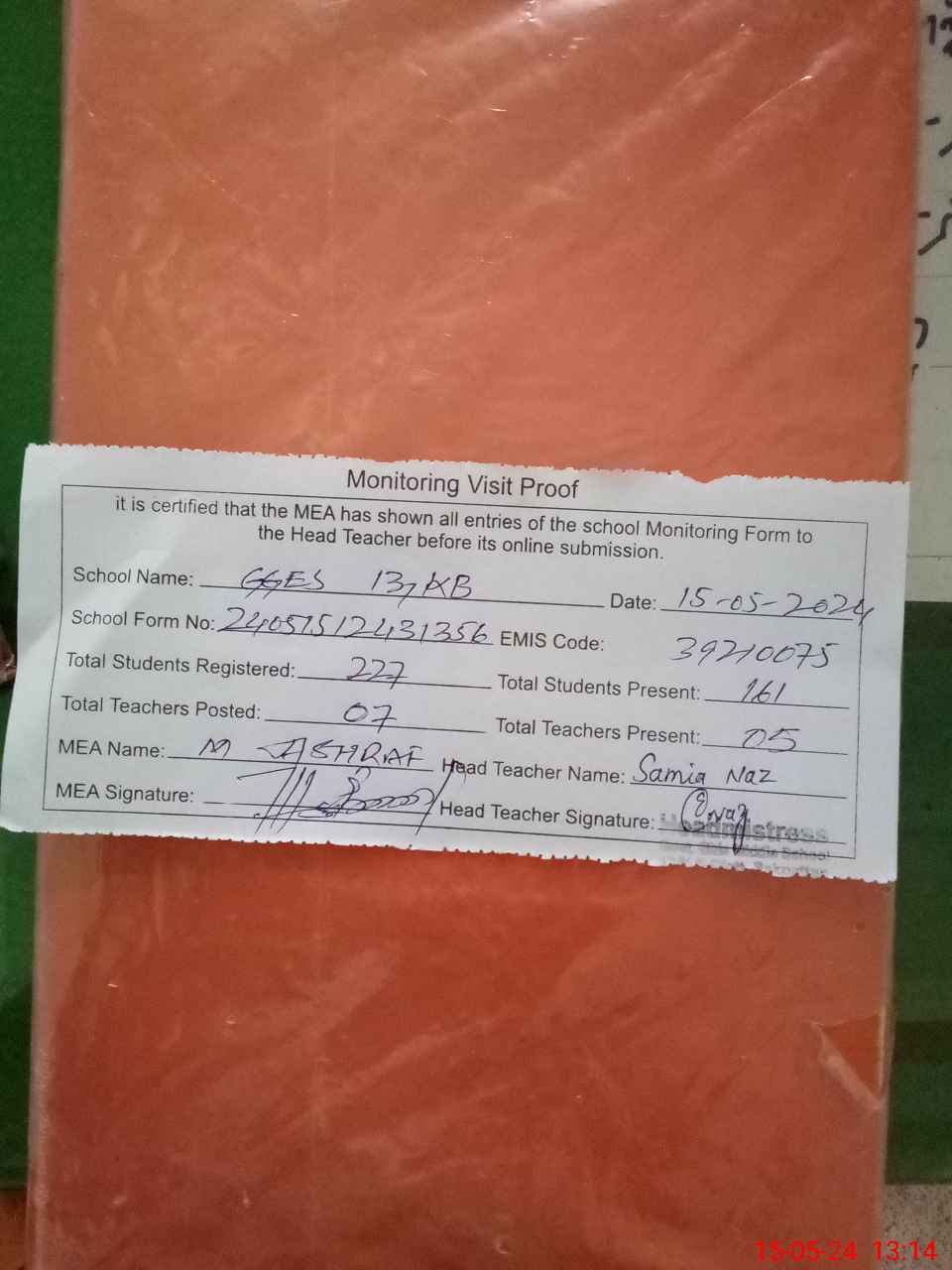 | Certified that this School was Inspected by the Undersigned MEA/DMO Today and the Information Stated Above is as Per Record. | |||||